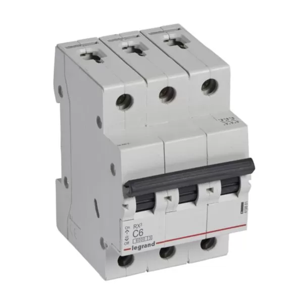 Thiết kế: MCB 3 cực (3P), dòng định mức 6A, khả năng cắt ngắn mạch 6kA, đường cong tác động loại C.