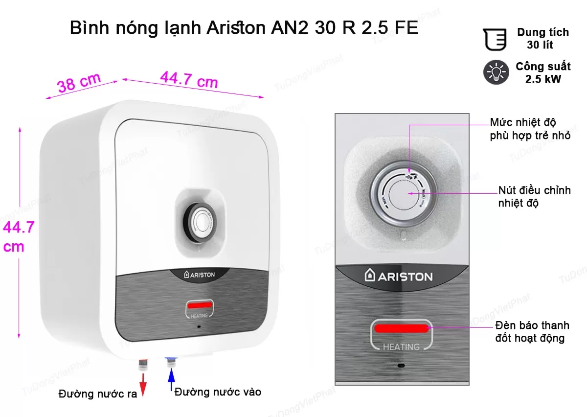 Bình nóng lạnh Ariston AN2 30 B 2.5 FE là bình nước nóng gián tiếp, 1 lần bật bình nước nóng có thể sử dụng nhiều lần. Giúp tiết kiệm điện năng cho gia đình.