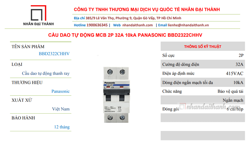 Cầu dao tự động Panasonic 2P 32A 10kA MCB Cầu dao bảo vệ quá tải và ngắn mạch Panasonic