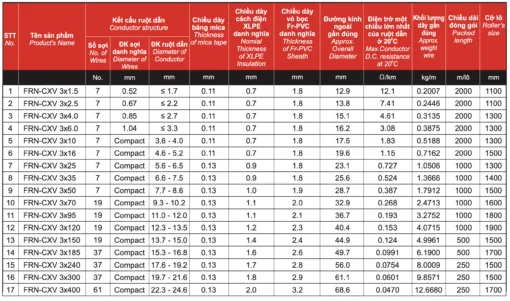 Thông số kỹ thuật cáp chống cháy Cadisun FRN-CXV 3×1.5 mm2: