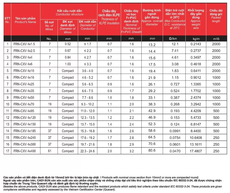 Thông số kỹ thuật cáp chống cháy Cadisun FRN-CXV 4×10 mm2: