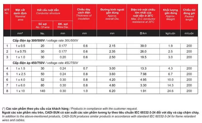 Thông số kỹ thuật dây đơn mền Cadisun vcsf 1x1.0