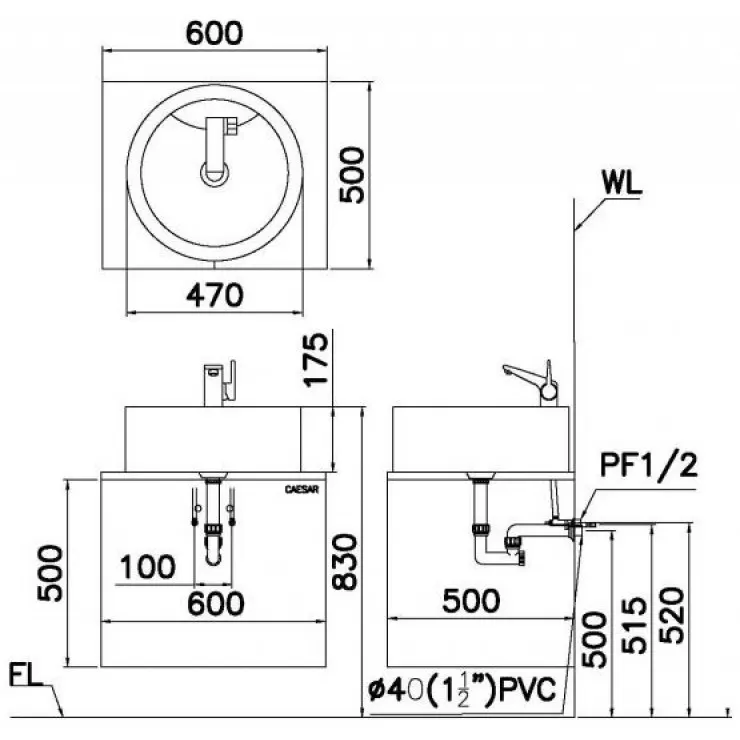 Bản vẽ kỹ thuật lavabo chậu rửa Caesar đặt bàn LF5240