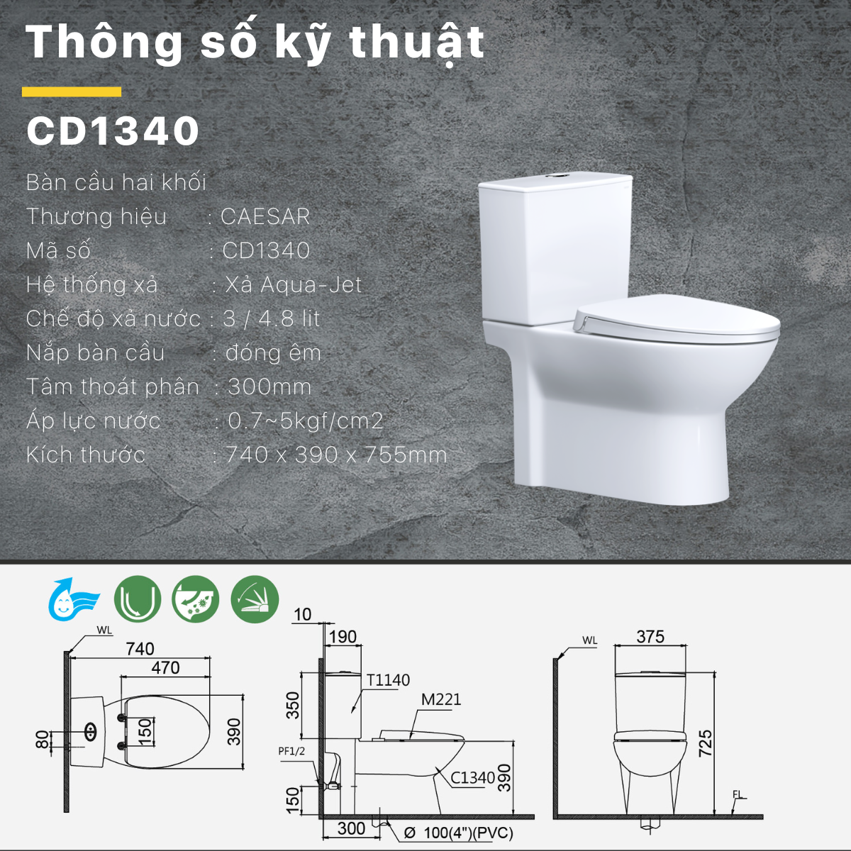 Được sản xuất từ sứ tráng men công nghệ Ý tiên tiến nhất đã tạo nên sản phẩm bồn cầu Caesar CD1340