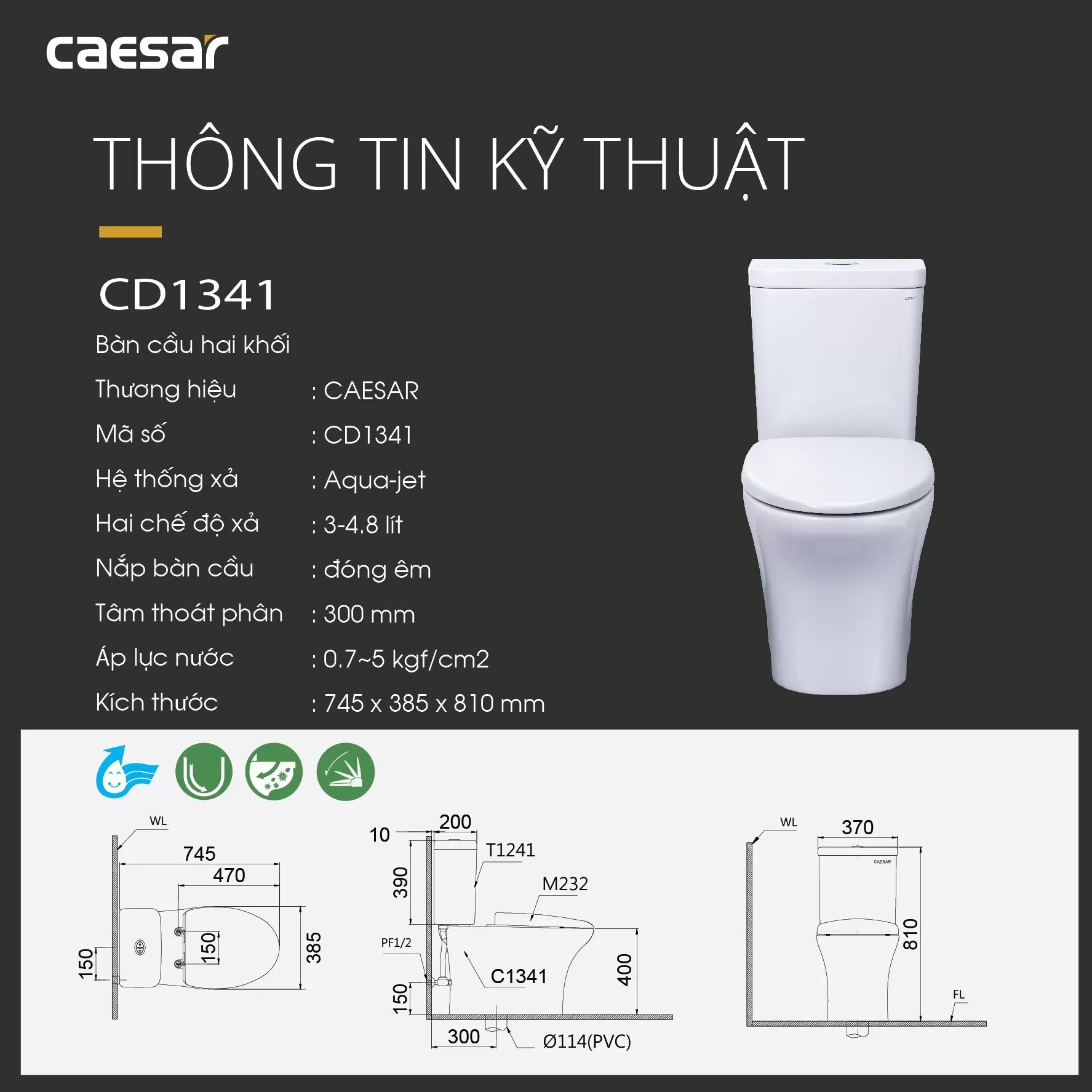 Thông tin sản phẩm bồn cầu 2 khối Caesar CD1341 nắp đóng êm