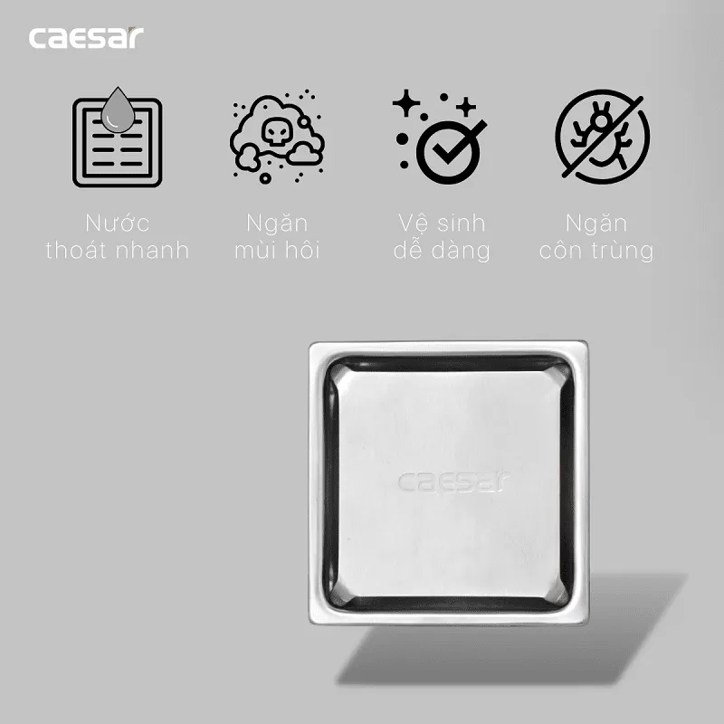 Phễu thoát nước Caesar chống hôi bằng luồng nước nên ngăn mùi hôi xông ngược từ đường ống thoát lên, phễu thoát sàn có chén chống hôi, đồng thời chính là chén ngăn tóc và các rác bẩn chảy theo đường nước xuống ống.