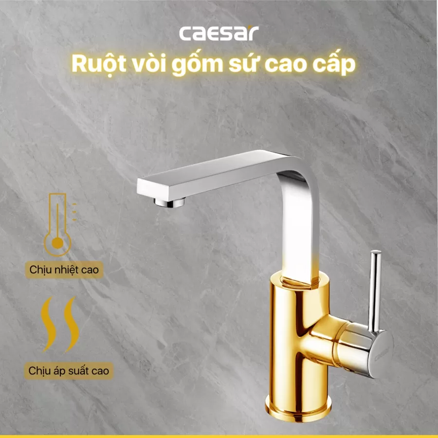 Bền bỉ: Vòi lavabo CAESAR B750CU được làm từ đồng thau nguyên chất, có độ bền cao, không bị gỉ sét. Lõi vòi được làm bằng sứ cao cấp, giúp cho việc đóng mở vòi nhẹ nhàng và êm ái.