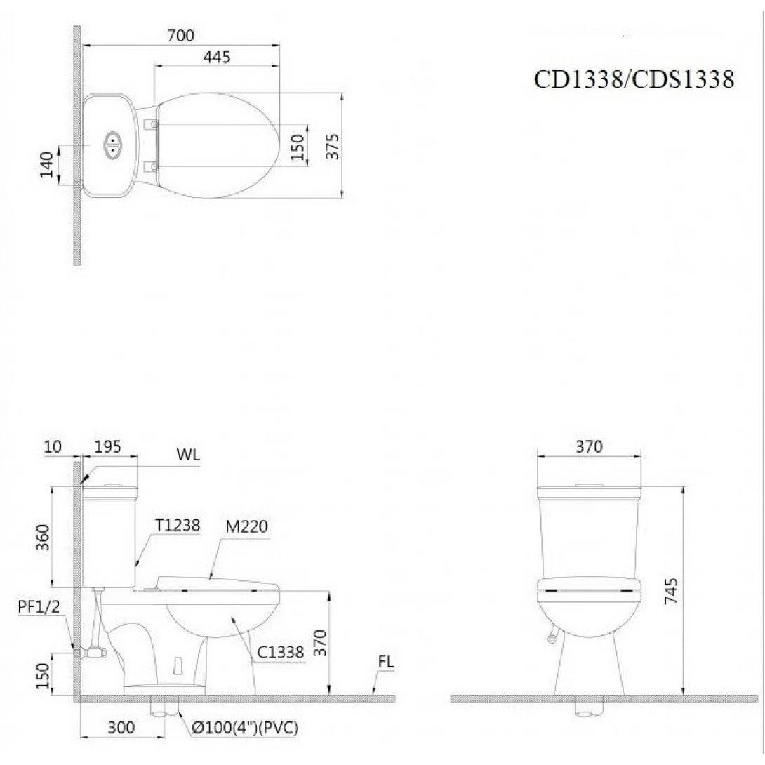 Caesar- Bộ bàn cầu 2 khối, 2 nút xả, Nắp êm CDS1338 gồm (CS1338 + T1238) (Bộ)