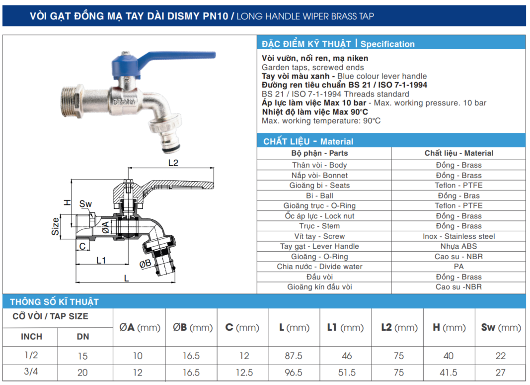 Vòi gạt đồng mạ tay dài DISMY PN10 thuộc thương hiệu là DISMY® là sản phẩm được thiết kế đặc biệt với chất liệu đồng mạ niken, mang lại vẻ ngoài sang trọng và độ bền vượt trội. Với tay gạt màu xanh nổi bật, vòi gạt này không chỉ mang lại sự tiện lợi trong sử dụng mà còn đảm bảo hiệu suất cao và tuổi thọ lâu dài.
