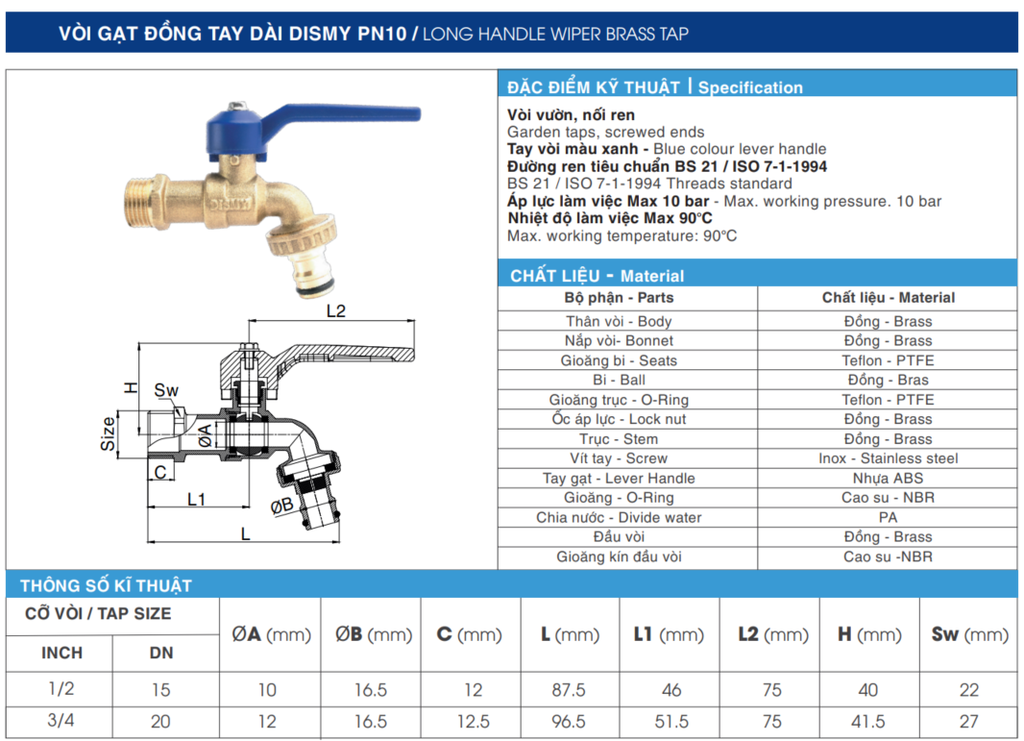 Vòi gạt đồng tay dài DISMY PN10 là lựa chọn hoàn hảo cho các hệ thống nước vườn, đảm bảo khả năng cung cấp nước ổn định và an toàn. Sản phẩm này được sử dụng rộng rãi trong các khu vườn, công viên, và các ứng dụng ngoài trời, mang lại sự tiện lợi và độ bền vượt trội.