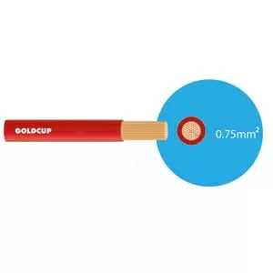 Goldcup - đơn mềm 1 * 0.75 mm - Đỏ Ruột dẫn: Đồng ủ mềm trong môi trường khí trơ. Số lõi: 1 Kết cấu: Nhiều sợi bện tròn cấp 5, cấp 6. Mặt cắt danh định: từ 0,75 mm2 đến 10 mm2 Điện áp danh định: 300/500V và 450/750V
