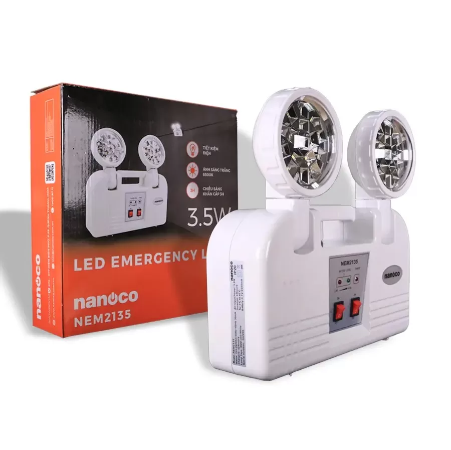Đèn Chiếu Sáng Khẩn Cấp Nanoco NEM21351 đạt chứng nhận PCCC, đáp ứng mọi tiêu chuẩn thoát hiểm. Đèn sử dụng Pin Lithium 2.2A có thời gian chiếu sáng dự phòng đến 3 giờ. Hai nguồn sáng chip LED SMD 32PCS - 6500K mạnh mẽ, tự động bật sáng khi có sự cố, giúp mọi người di chuyển và tìm lối thoát hiểm nhanh chóng. Thân đèn làm từ nhựa ABS cao cấp cho độ bền vượt trội.