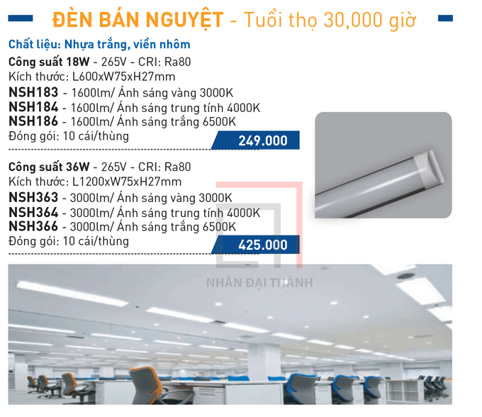 Đèn LED bán nguyệt Nanoco là sản phẩm mới nhất được hãng cho ra mắt nhằm thay thế máng đèn Tube kiểu truyền thống. Đèn được làm bằng chất liệu nhựa trắng và viền nhôm tản nhiệt tốt. Kiểu dáng thiết kế sang trọng hiện đại, tăng tính thẩm mỹ cho ngôi nhà.