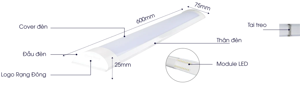 Thân đèn được thiết kế có kèm tai treo, người dùng có thể dễ dàng lắp đặt và linh hoạt gắn trần, gắn tường hoặc treo trần.