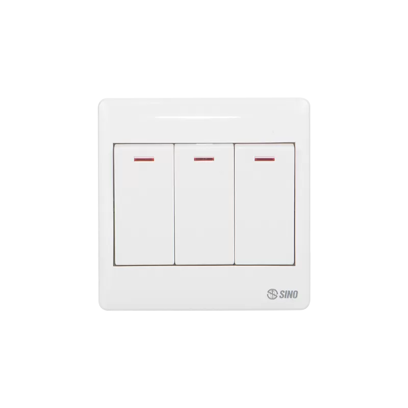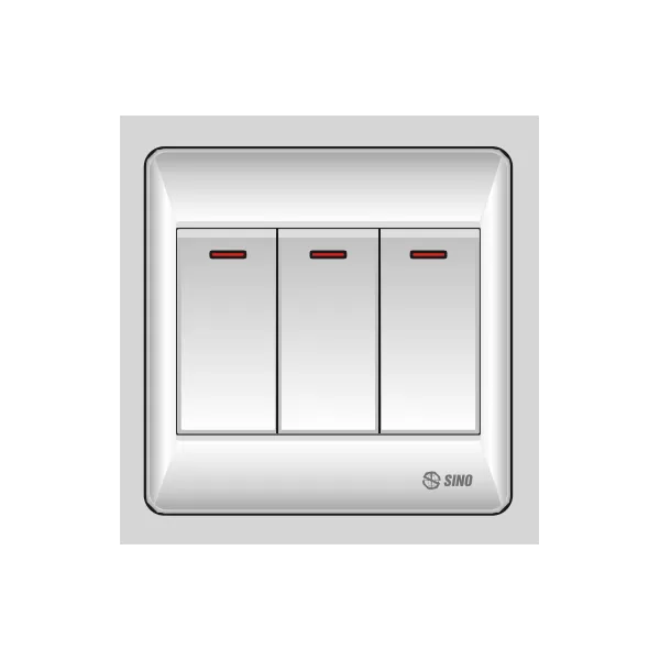 Công tắc ba 1 chiều phím lớn thiết bị điện công nghiệp, thiết bị điện Sino, mặt và ổ cắm kiểu S98, các loại công tắc phím lớn: công tắc đơn/đôi/ba 1 chiều, 2 chiều, có đèn báo đỏ, công tắc tự động, công tắc dùng thẻ từ… giá cả cạnh tranh.