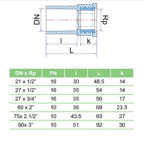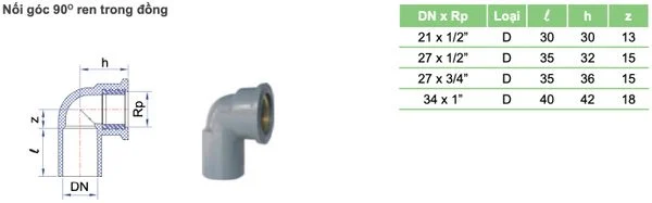 Thông số kỹ thuật Nối góc ren trong đồng uPVC DN21x1/2 PN16