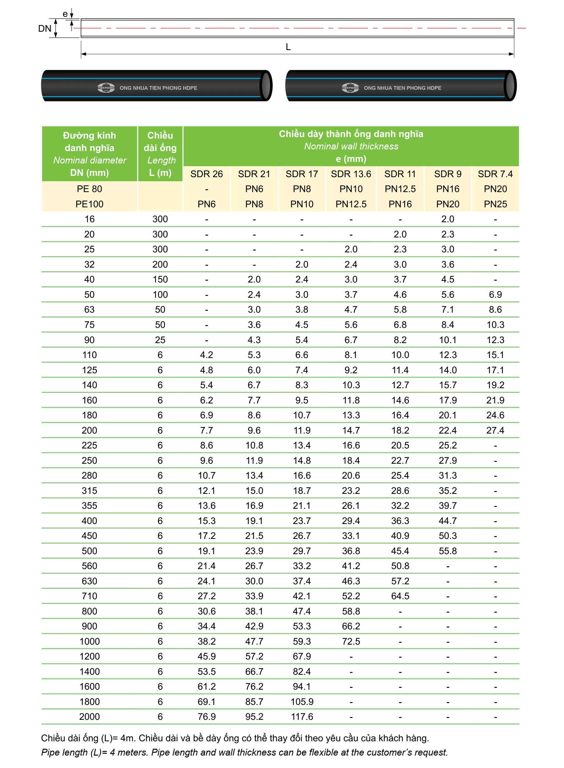 Tiền Phong - PE100 Ống 110 - PN6 Ống nhựa HDPE Tiền Phong PE100 PN6 và phụ tùng Ống Nhựa HDPE cực kỳ bền bỉ, không bị ăn mòn và gỉ sét bởi các loại hóa chất, không bị lão hóa bởi nhiệt độ và tia cực tím, chịu được độ va đập rất tốt, lại có độ uốn dẻo nên chịu được áp suất cao. Ống và phụ tùng HDPE có giá thành rẻ hơn các loại ống thép, ống bê tông cốt thép. Đặc biệt, do trọng lượng của ống và phụ tùng HDPE khá nhẹ nên chi phí lắp đặt, vận chuyển thấp, phương thức đấu nối đơn giản và tuổi thọ cao (nếu thiết kế và lắp đặt đúng kỹ thuật thì độ bền của ống và phụ tùng HDPE không dưới 50 năm). Lưu ý: nhiệt độ sử dụng cho phép ≤ 40°C.
